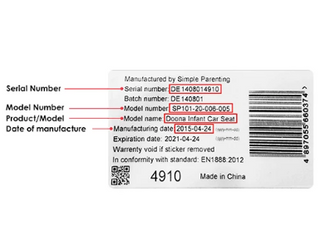 In order to properly register your child restraint system, you will need to provide the model number, serial number and date of manufacture. This information is printed on the registration card and can also be found on a white label located on the back of the child restraint system.